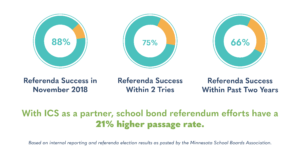 With ICS as a trusted partner and advocate, school bond referendum efforts have a 21% higher passage rate based on election cycles from the past two years. In November 2018, ICS had an 88% success rate with districts overall, and the success rate for the past two years is 66%. Rural districts make up a vast majority of these successes. In the past decade, ICS has supported over 60 Minnesota school districts in securing $1.7 billion in voter-approved funds. For all referenda, ICS has a 75% success rate within two tries. Political climates vary throughout the state, and ICS meets challenges through continued stakeholder engagement.  (These statistics are based on election results posted by the Minnesota School Boards Association).
